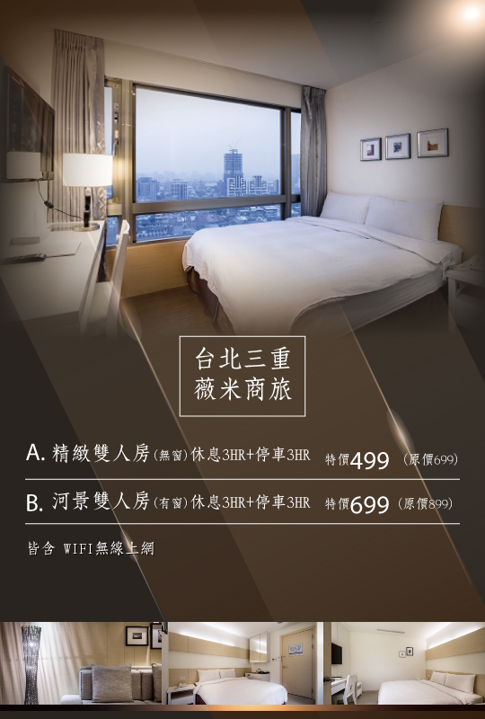 只要499元起,即可享有【台北三重-薇米商旅】台北橋站步行只要五分鐘!三重越夜越美AB雙人休息方案〈含A.精緻雙人房(無窗)/B.河景雙人房(有窗) 休息3HR + 停車3HR + wifi無線上網〉